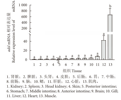 adsl gene was subdivided into 12 exons and 11 introns. Its mRNA had the highest expression level in muscle tissue and was significantly higher than other tissues (